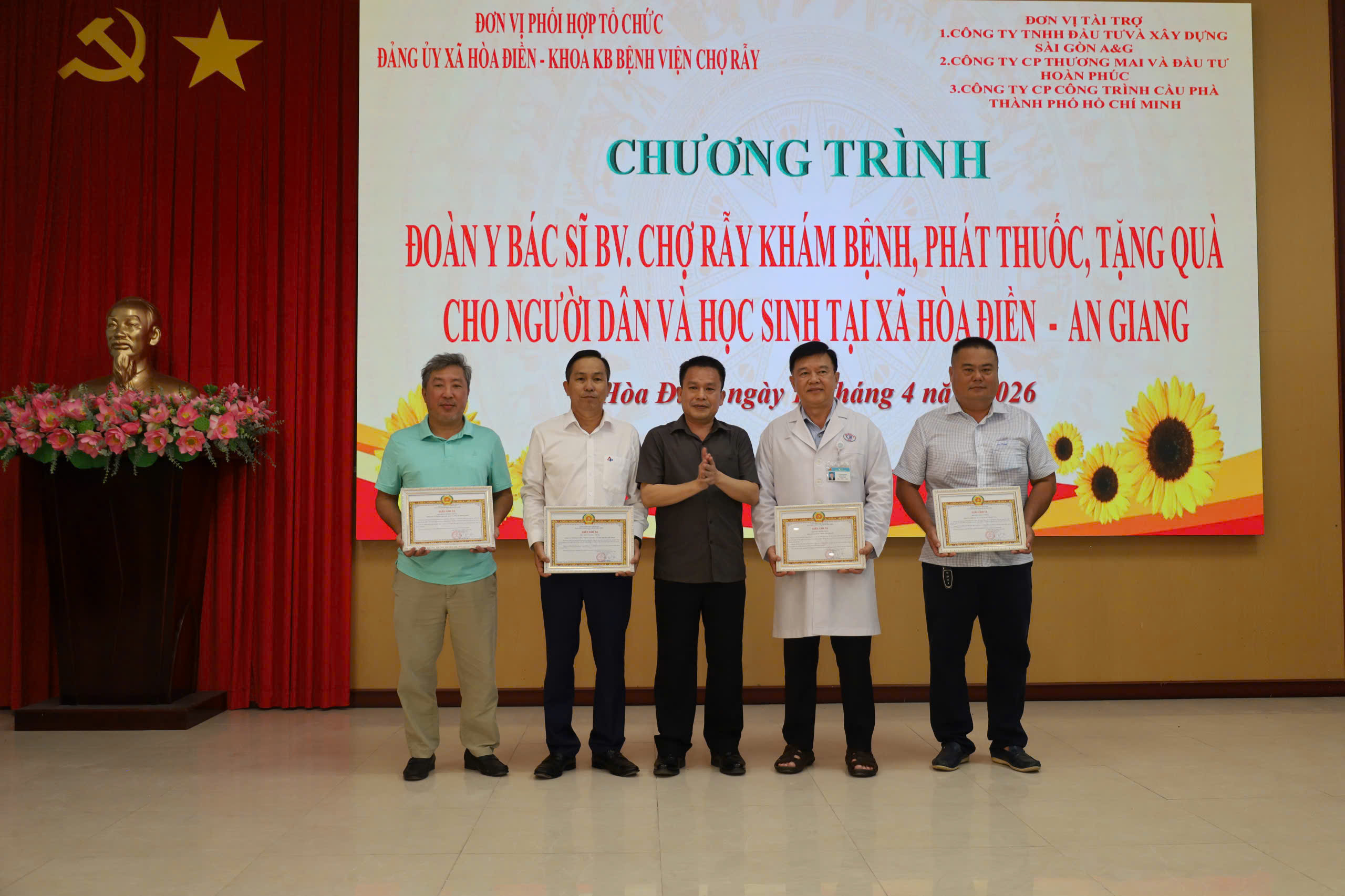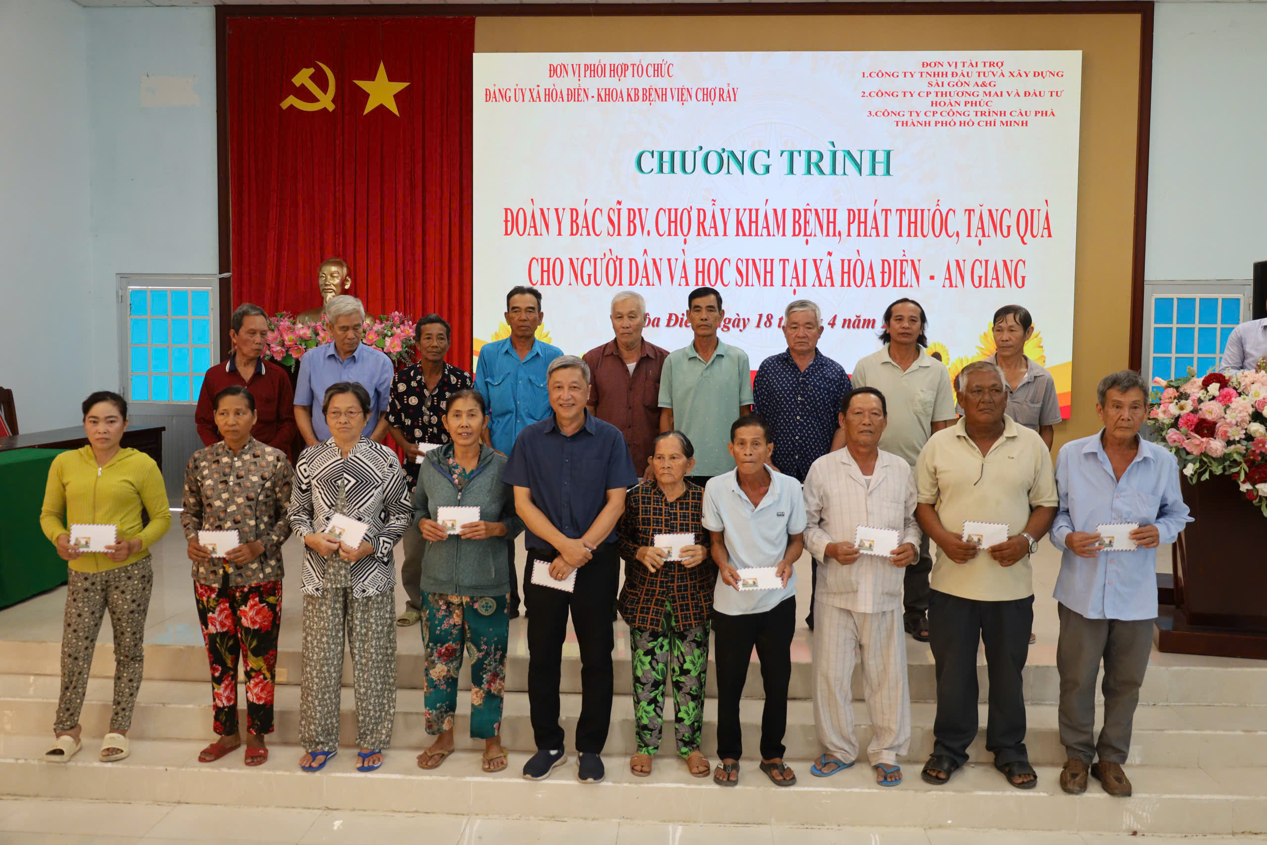 Sáng ngày 18/4, Đảng ủy, HĐND, UBND, Ủy ban MTTQ Việt Nam xã Hòa Điền (tỉnh An Giang) phối hợp Khoa Khám bệnh Bệnh viện Chợ Rẫy TP. Hồ Chí Minh tổ chức chương trình khám bệnh, phát thuốc miễn phí và tặng quà cho thương bệnh binh, gia đình chính sách, hộ nghèo, cận nghèo, hộ có hoàn cảnh khó khăn, học sinh nghèo hiếu học trên địa bàn. Tham dự chương trình có ông Nguyễn Trường Sơn, Nguyên Thứ trưởng Bộ Y tế, nguyên Giám đốc Bệnh viện Chợ Rẫy, ông Nguyễn Quốc Bình, Phó Giám đốc Bệnh viện Chợ Rẫy, bà Lâm Nguyễn Nhã Trúc, Chủ tịch Công đoàn Bệnh viện Chợ Rẫy, Trưởng khoa Chăm sóc sức khỏe yêu cầu. Về phía Lãnh đạo xã Hòa Điền có ông Lê Thanh Hưởng, Bí thư Đảng ủy xã, bà Nguyễn Thị Mỹ Nhung, Phó Bí thư Thường trực Đảng ủy – Chủ tịch HĐND xã, ông Hồ Thành Trương, Phó Chủ tịch UBND xã.