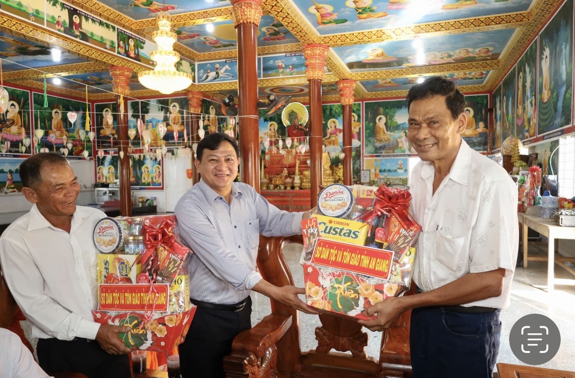 Ảnh. Bí thư Đảng ủy xã Hòa Điền Lê Thanh Hưởng, thăm, chúc Tết Chôl Chnăm Thmây tặng quà Đại đức Trịnh Trinh, Trụ trì chùa Núi Trầu, xã Hòa Điền.