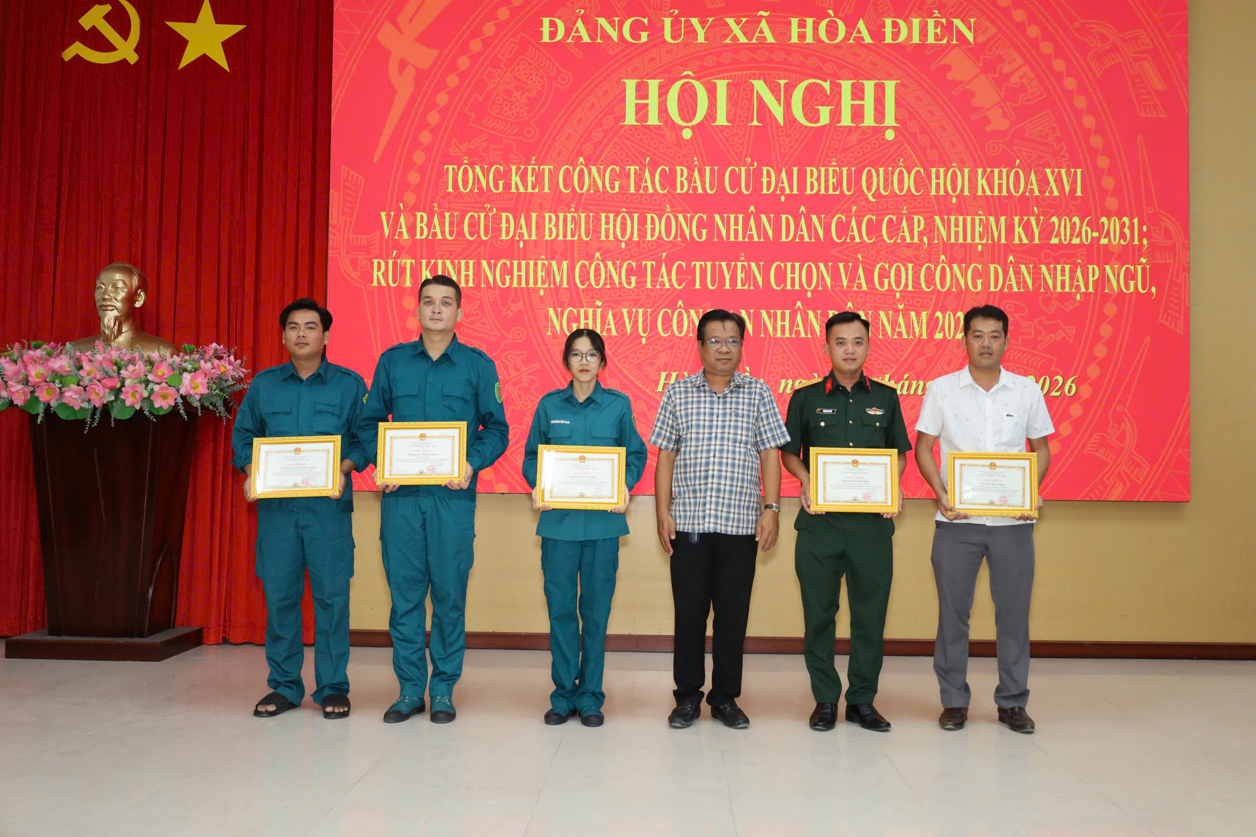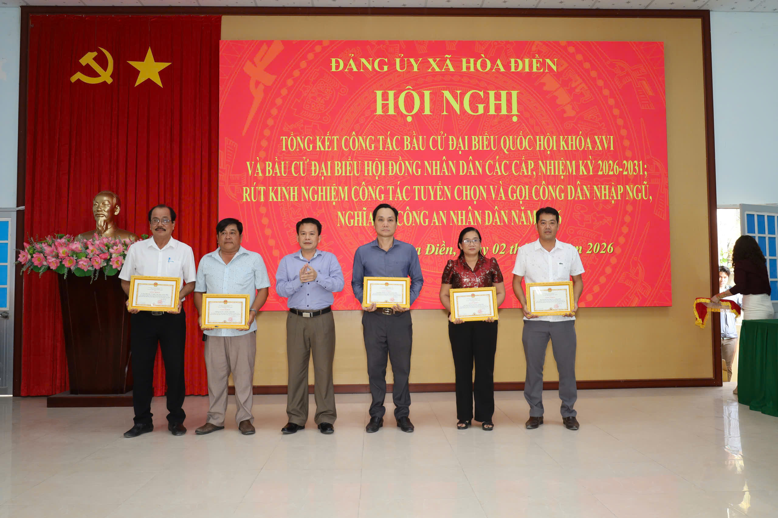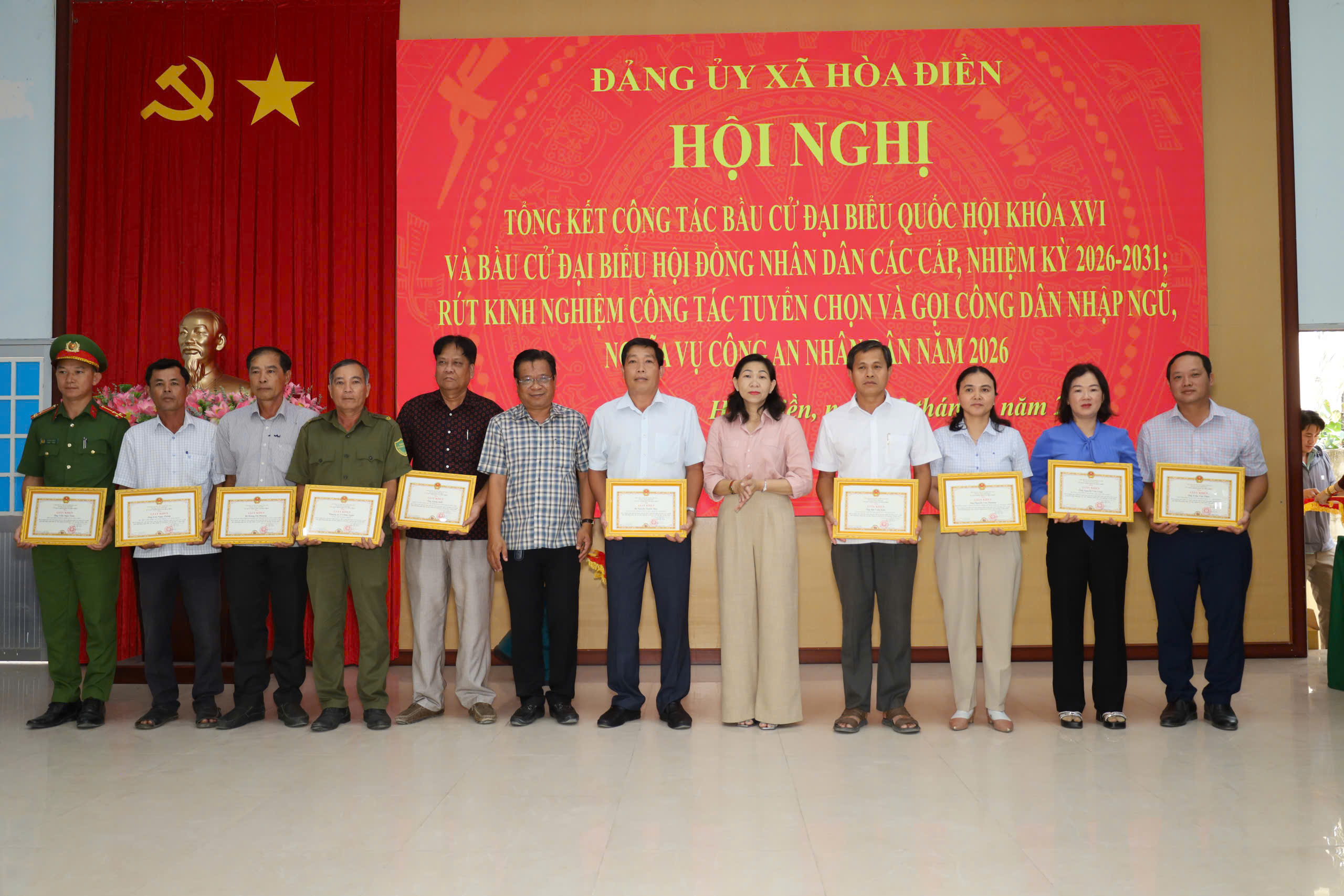 Dịp này, Chủ tịch UBND xã Hòa Điền tặng giấy khen cho 5 tập thể, 14 cá nhân có thành tích xuất sắc trong công tác bầu cử đại biểu Quốc hội khóa XVI và đại biểu HĐND các cấp nhiệm kỳ 2026-2031 trên địa bàn xã; tặng giấy khen cho 3 tập thể, 7 cá nhân có thành xuất sắc trong công tác tuyển chọn và gọi công dân nhập ngũ, công dân thực hiện nghĩa vụ tham gia Công an nhân dân năm 2026./.