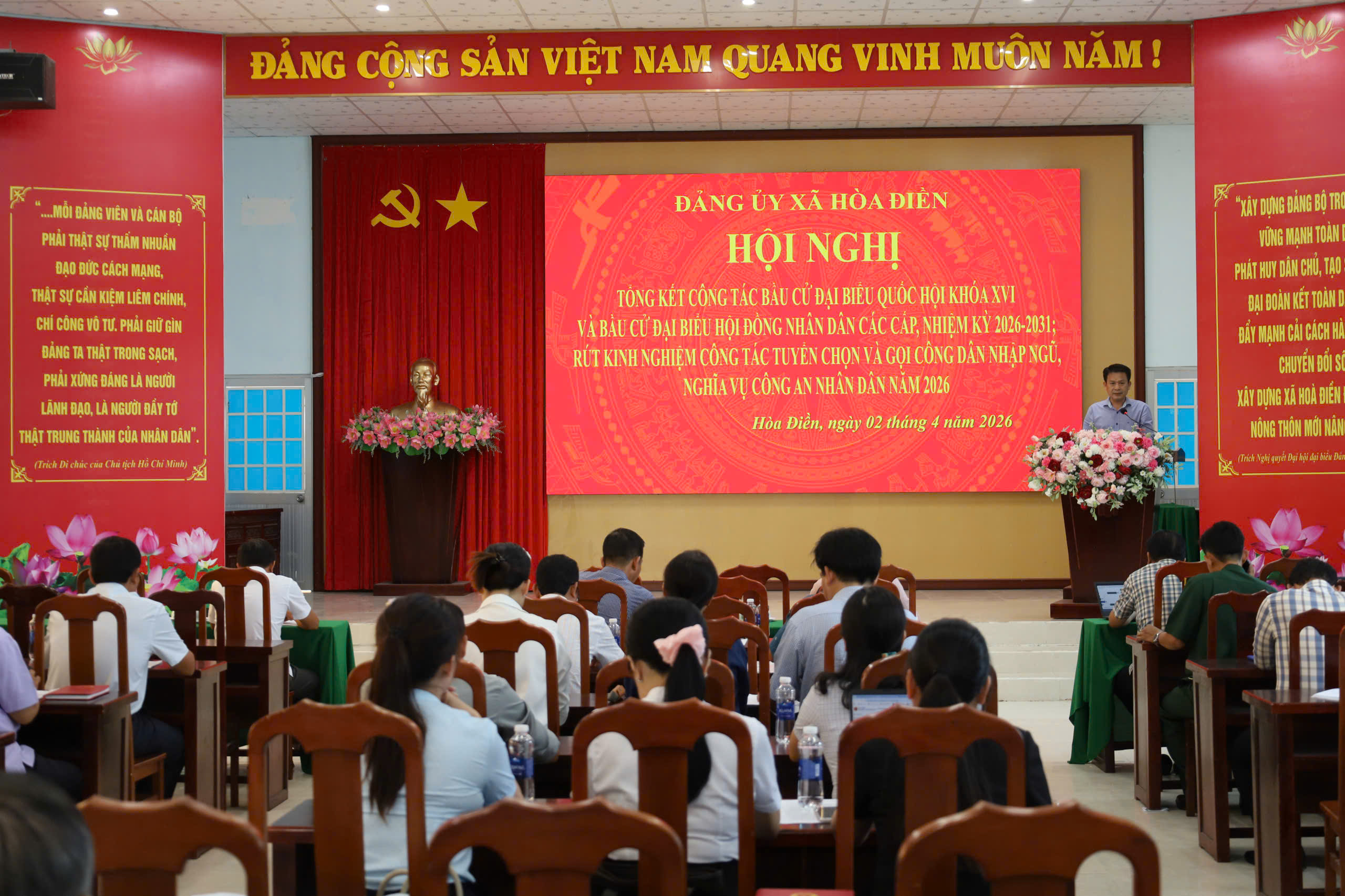 Chiều ngày 02/4, Ban Thường vụ Đảng ủy xã Hòa Điền tổ chức cuộc họp để nghe Ủy ban Bầu cử xã và Hội đồng Nghĩa vụ Quân sự xã báo cáo tổng kết công tác bầu cử đại biểu Quốc hội khóa XVI và đại biểu Hội đồng nhân dân các cấp, nhiệm kỳ 2026 – 2031; rút kinh nghiệm công tác tuyển chọn và gọi công dân nhập ngũ, nghĩa vụ Công an nhân dân năm 2026. Tham dự Hội nghị có đồng chí Lê Thanh Hưởng, Bí thư Đảng ủy xã; đồng chí Nguyễn Thị Mỹ Nhung, Phó Bí thư Thường trực Đảng ủy xã – Chủ tịch HĐND xã; đồng chí Võ Quang Phúc, Phó Bí thư Đảng ủy xã – Chủ tịch UBND xã; đồng chí Ngô Sện, Ủy viên Ban Thường vụ Đảng ủy xã – Chủ tịch Ủy ban MTTQ Việt Nam xã và Thành viên Ủy ban Bẩu cử xã, Hội đồng Nghĩa vụ Quân sự xã, Bí thư, Trưởng các ấp, Ấp đội trưởng các ấp.