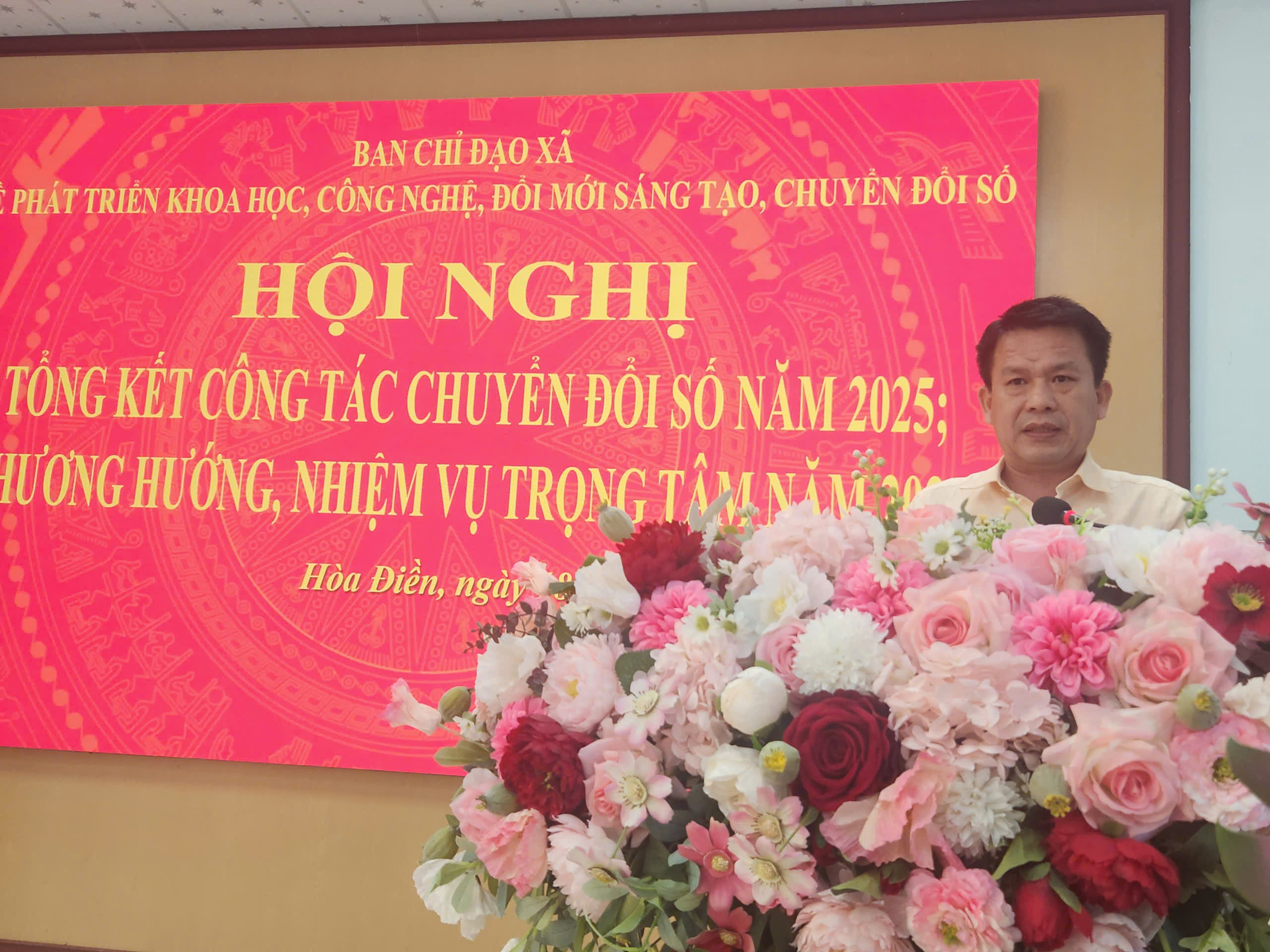 Chiều ngày 18/3/2026, Ban Chỉ đạo về phát triển khoa học, công nghệ, đổi mới sáng tạo và chuyển đổi số xã Hòa Điền tổ chức Hội nghị tổng kết tình hình thực hiện Nghị quyết số 57-NQ/TW của Bộ Chính trị về đột phá phát triển khoa học, công nghệ, đổi mới sáng tạo và chuyển đổi số quốc gia năm 2025. Đồng chí Lê Thanh Hưởng – Bí thư Đảng ủy xã kiêm Trưởng Ban chỉ đạo chủ trì hội nghị, cùng dự Hội nghị có đồng chí Nguyễn Thị Mỹ Nhung, Phó Bí thư Thường trực Đảng ủy – Chủ tịch HĐND xã; đồng chí Võ Quang Phúc, Phó Bí thư Đảng ủy – Chủ tịch UBND xã; đồng chí Ngô Sện, Ủy viên Ban Thường vụ Đảng ủy – Chủ tịch Ủy ban MTTQ Việt Nam xã.